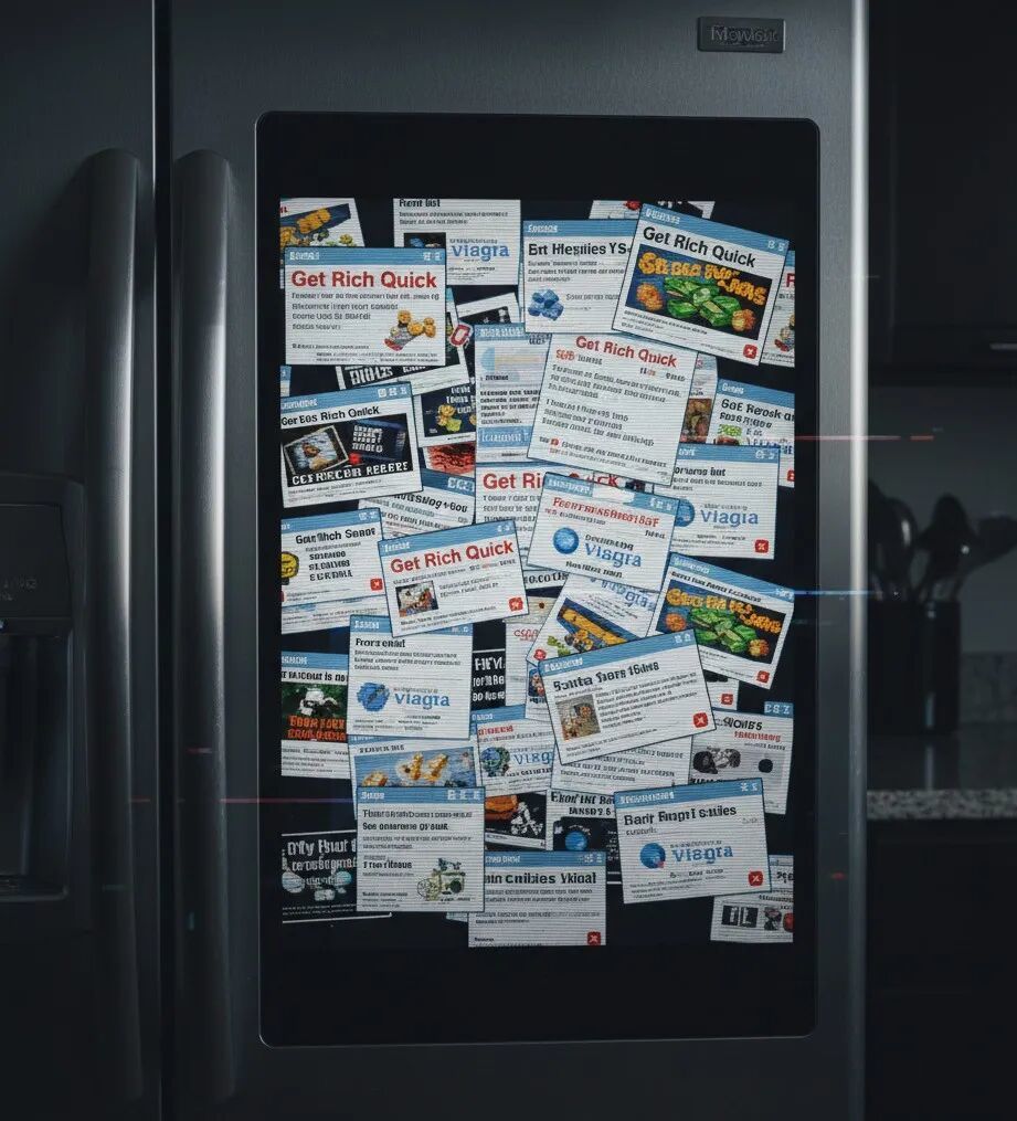 和扫地机器人相比,智能冰箱的背叛更加隐蔽,荒诞程度更是翻倍——有没有想过,你的冰箱不止能装肉鸡,而且自己也是一个「肉鸡」,专门负责发送垃圾邮件?