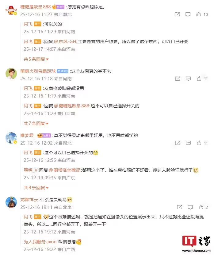 评论区有网友对灵动岛这一设计提出质疑,博主表示:“这个可以自己选择开关的。”