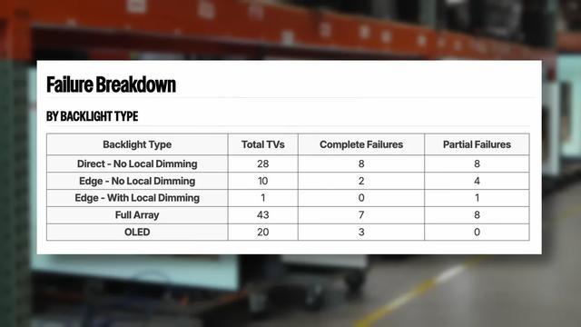再来看背光类型对耐用性的影响,测试结果显示,无背光设计的 OLED 电视(包括 WOLED 和 QD-OLED)是长期使用下故障率最低的品类。而采用侧入式 LED 背光阵列的 LCD 电视故障率最高。RTINGS 解释称,导光路径是这类电视的常见故障点,多数故障表现为至少有一颗 LED 灯珠完全熄灭。由于大多数 LED 灯珠采用串联方式连接,一旦其中一颗故障,很可能导致整排甚至整组灯珠失效,严重时会造成整个背光系统瘫痪。