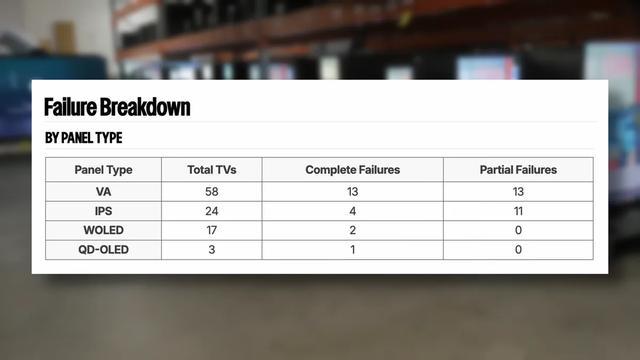 IT之家注意到,测试数据显示,IPS 面板的表现最差:24 台样机中有 15 台出现故障,但这一结论需要结合具体情况辩证看待。如今大多数 IPS 面板电视都未配备局域控光技术,正是其背光系统的缺陷拉低了整体数据,使其故障率显得尤为突出。局域控光技术目前基本只应用于 VA 面板电视,这也让 VA 面板的可靠性相对更高。例如 LG 旗下搭载侧入式背光的 IPS 电视,故障率就明显高于其采用背光设计的其他机型。