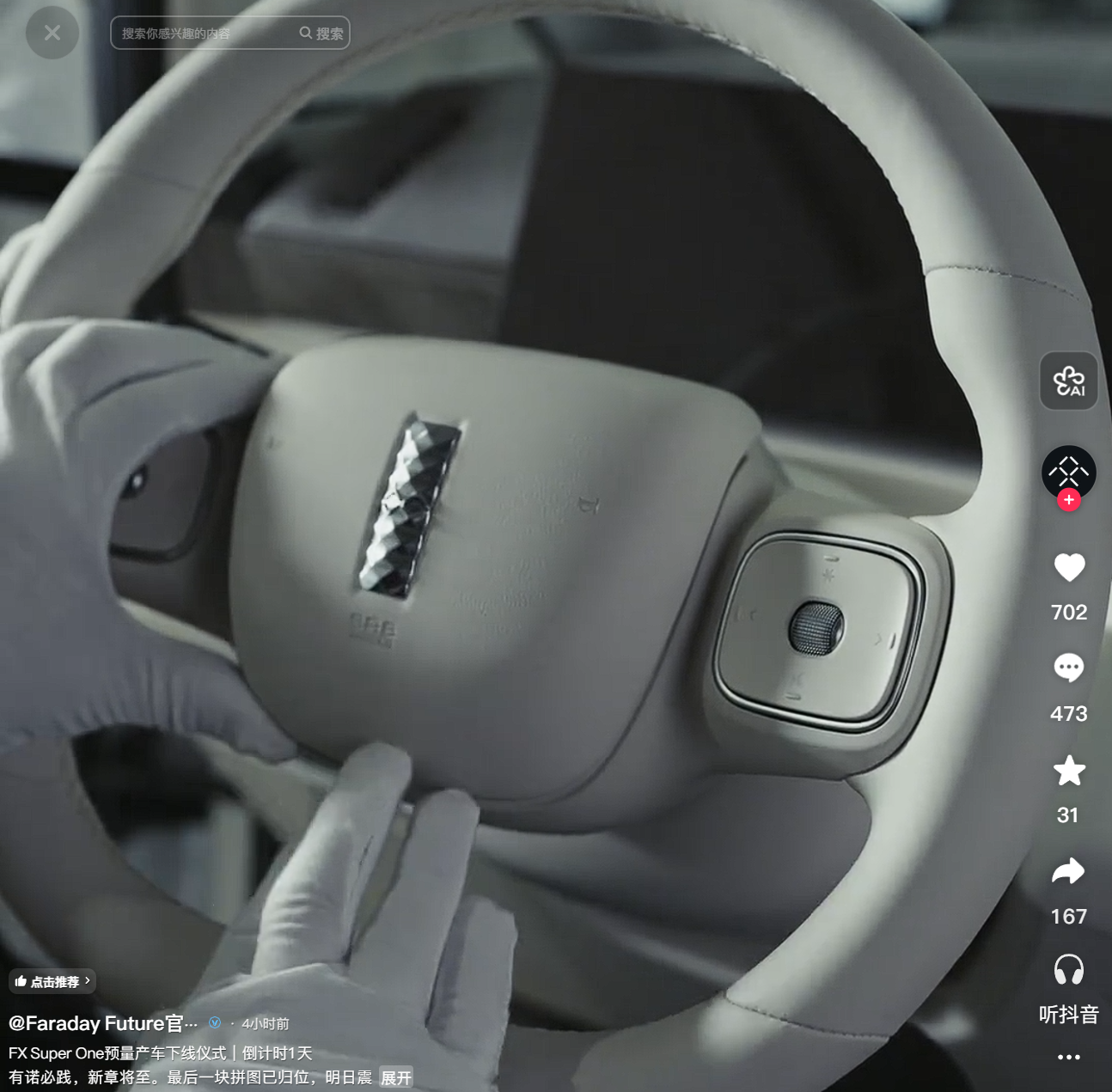 在视频的闪回画面里,FX Super One 的细节公布:新车的轮毂采用纯白设计,中心处为 FX 车标;车内的方向盘也有车标,但是与轮毂不同的是,该处的车标印在一块亮面装饰条上,而非直接印在方向盘上。