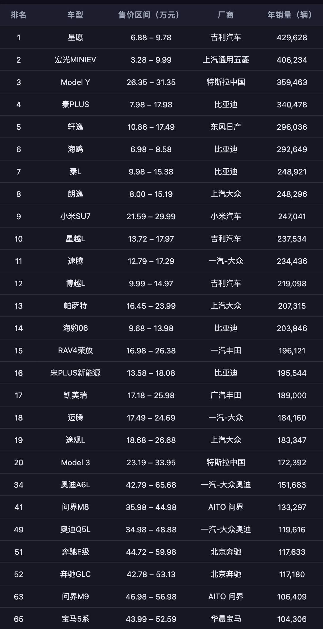 正因如此即便 Model Y 本身并未「变弱」,它也在 2025 年让出了年度销冠的位置。取而代之的是星愿这类主打高性价比、精准切入大众市场的车型。