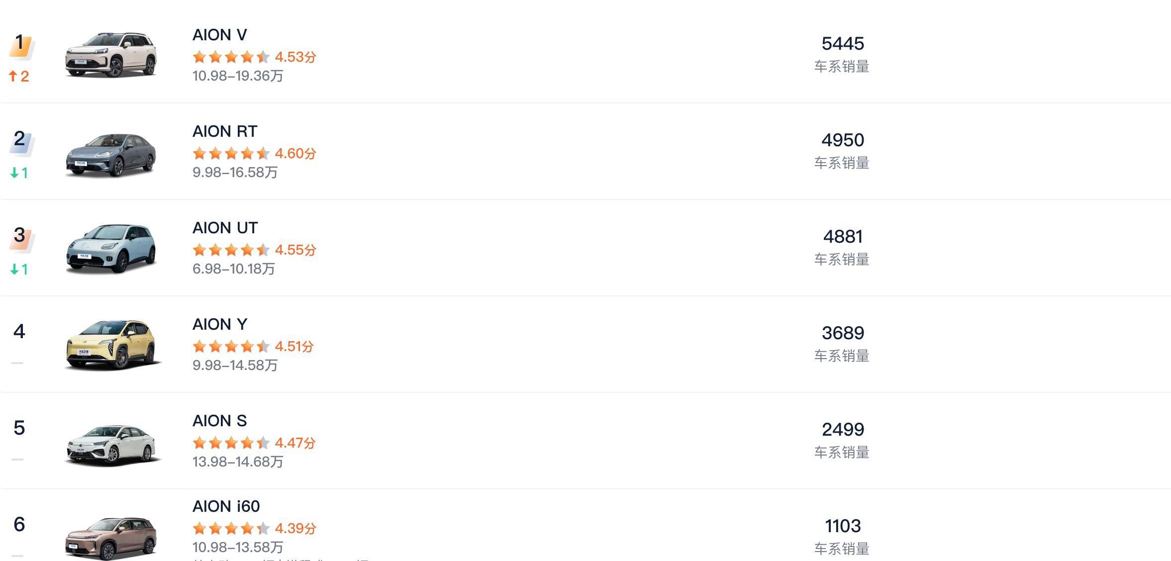 2023 年,埃安尚处在高光时刻。AION Y 以 23.5 万辆的成绩位列第 12 名,AION S 也以 22 万辆紧随其后(第 15 名),两款车型共同撑起了品牌在主流市场的存在感。然而到了 2024 和 2025 年,这两款曾经的主力车型却彻底从销量榜上消失,再无踪影。