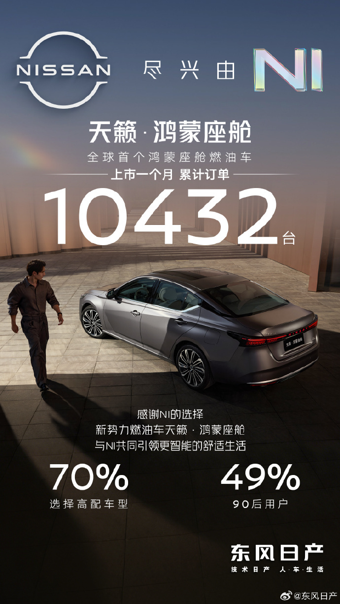 IT之家 12 月 21 日消息,东风日产今日宣布天籁・鸿蒙座舱上市一个月,累计订单突破 10432 台。