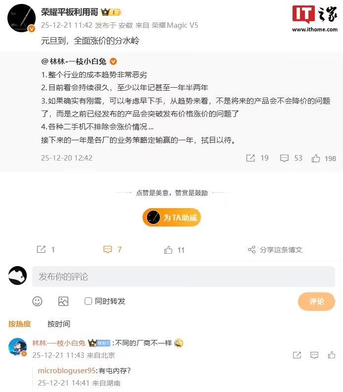 IT之家注意到,荣耀终端股份有限公司平板与 IOT 产品领域总经理 @荣耀平板利用哥 透露:“元旦到,全面涨价的分水岭。”这意味着元旦将是新机涨价的转折时刻。不过,林林也表示:“不同的厂商不一样。”