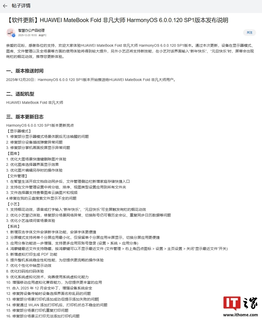 IT之家 12 月 22 日消息,华为 MateBook Pro、MateBook Fold 非凡大师已于 12 月 20 日陆续推送 HarmonyOS 6.0.0.120 版本。据介绍,本次更新,设备在图库、文件管理以及全场景等方面的使用体验将得到较大提升,另外小艺还将支持新技能。