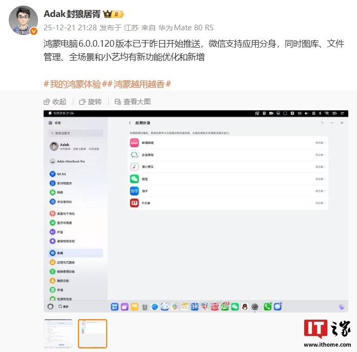 据博主 @Adak封狼居胥 昨日分享,鸿蒙电脑升级 6.0.0.120 版本后,微信支持应用分身。此外,博主分享的截图显示,支持应用分身的 App 还有哔哩哔哩、企业微信、糖心音乐、知乎、IT之家。