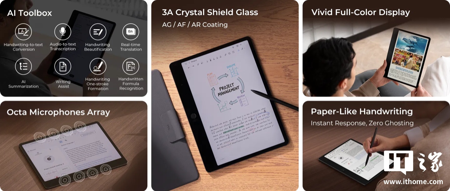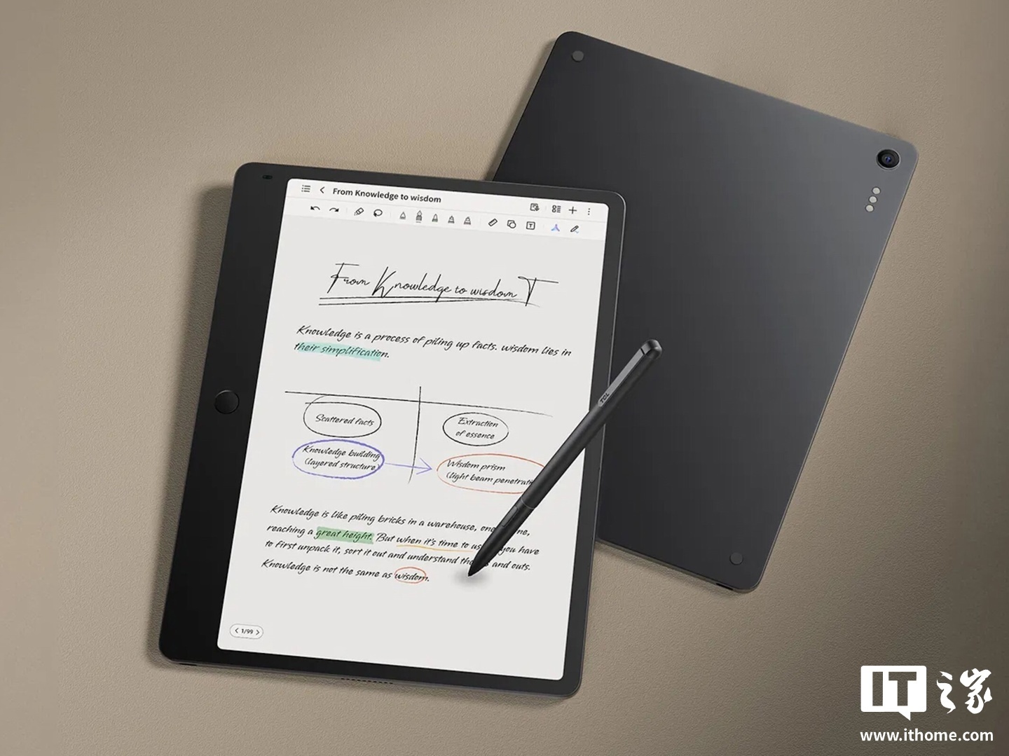 IT之家了解到,这款平板重 500 克,机身尺寸为 260.1*196.5*5.5mm,便携性适中,适合随身携带,搭载一块彩色显示屏,可呈现 1670 万种颜色,支持手写笔操作,可用于绘制草图、记笔记等,号称拥有“极低的输入延迟”。