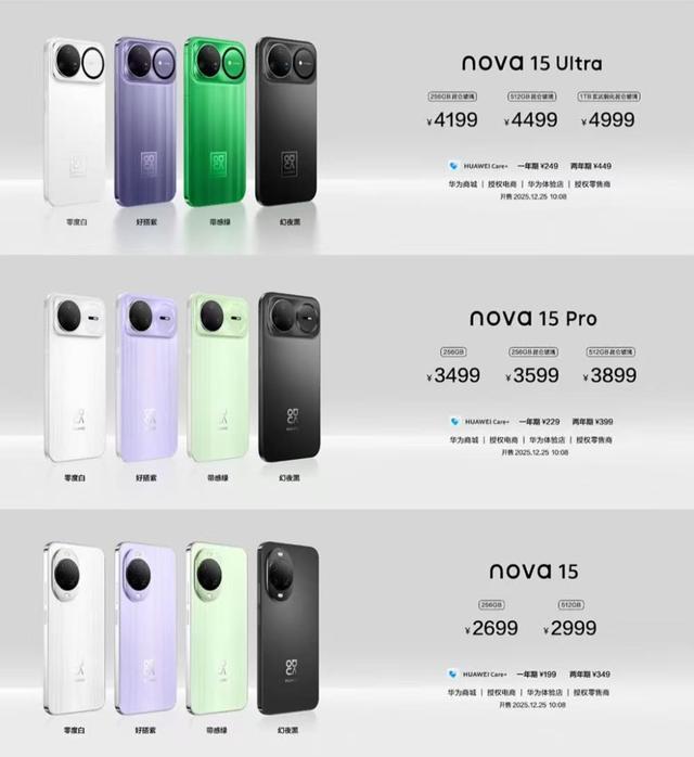 三款产品起售价分别为:nova 15 Ultra 4199元起,nova 15 Pro3499元起,nova 15则为2699元起。