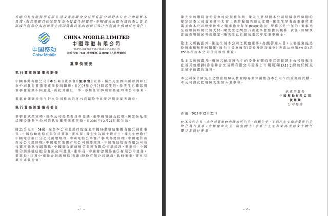 中国移动:委任陈忠岳为董事长,杨杰辞任 凤凰网科技讯 12月22日,中国移动在港交所公告,杨杰因年龄原因辞任中国移动执行董事兼董事长的职务,自2025年12月22日起生效。 董事会宣布,经公司提名委员会提议、董事会审议及批准,陈忠岳已获委任为公司执行董事兼董事长,自2025年12月22日起生效。 据悉,陈忠岳现年54岁,现为中国移动最终控股股东中国移动通信集团有限公司董事长;中国移动通信有限公司董事、董事长。 Published by 风君子 独自遨游何稽首 揭天掀地慰生平 View all posts by 风君子