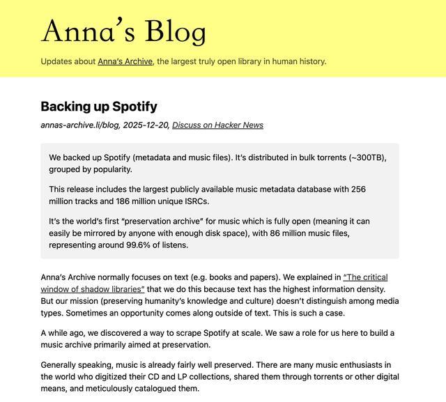 IT之家 12 月 22 日消息,全球最大音乐流媒体平台 Spotify 遭到影子图书馆组织“安娜的档案”入侵。该组织几乎完整抓取了 Spotify 平台内容,下载了约 300TB 音乐文件,并通过 BT 种子进行非法分发。
