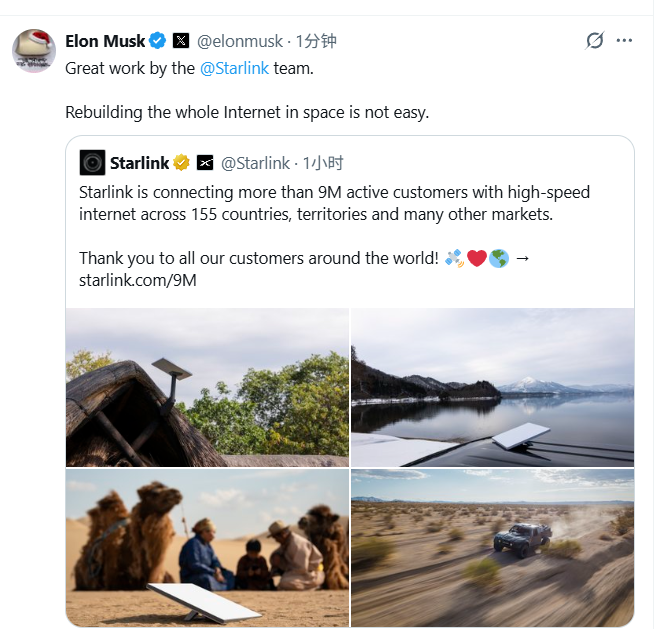 凤凰网科技讯 12月23日,SpaceX首席执行官兼首席技术官埃隆·马斯克宣布:“星链全球活跃用户突破900万。” 此前,11月6日,马斯克宣布,星链全球用户数量已突破800万。