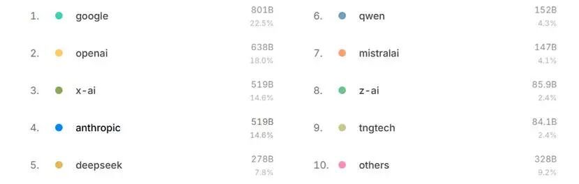 所以这可能是一个需要长期完善的议题,今天我们以目前能够收集到的数据做一个浅析,数据源取自OpenRouter,或有误差,但为大家提供几种简要的思路。