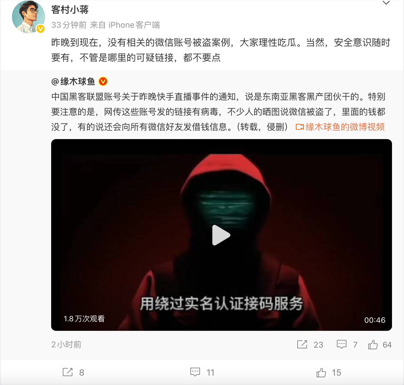 稍早前,微信员工“客村小蒋”也回应称,“昨晚到现在,没有相关的微信账号被盗案例,大家理性吃瓜。当然,安全意识随时要有,不管是哪里的可疑链接,都不要点。”