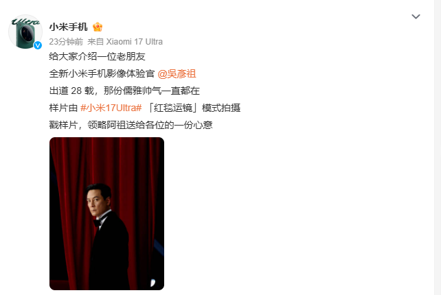 凤凰网科技讯 12月23日,小米手机今日宣布,知名演员吴彦祖正式成为其手机影像体验官。在此次官宣中,小米同步发布了一组由吴彦祖出镜、使用小米17 Ultra“红毯运镜”模式拍摄的人像样张。