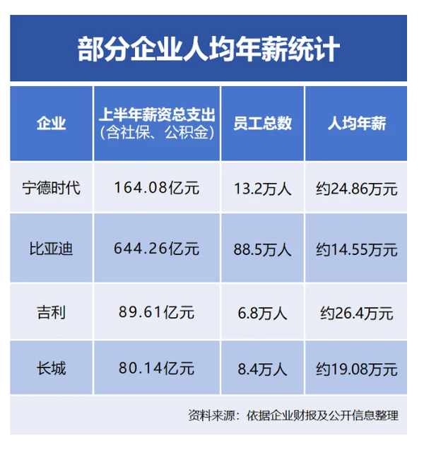 几乎同期,宁德时代宣布自2026年1月1日起,对其全资子公司所有基层员工每月基本工资上调100至200元。这一举措与其强劲的盈利能力相匹配——2025年上半年,宁德时代利润总额达304.85亿元,超过同期19家上市车企利润总和。财报显示,其上半年员工平均年薪约24.86万元,在行业中处于领先位置。