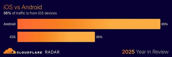 在移动生态方面,Cloudflare的数据显示,2025年iOS设备贡献了全球移动设备流量的35%,而安卓设备占据了65%的份额。值得注意的是,iOS的流量份额同比增长了2个百分点,从2024年的33%上升至2025年的35%。Cloudflare指出,安卓设备因广泛的价格区间、形态和功能而占据了全球移动流量的大部分。