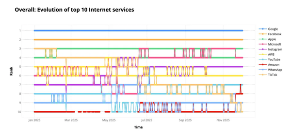 根据Cloudflare基于其全球DNS数据对主要在线服务相对受欢迎程度的排名,苹果在2025年表现强劲。报告指出,苹果在年初超越了TikTok,并稳居第三位,直到7月左右开始与微软交换位置。尽管如此,“苹果最终以第三名结束了这一年”,而微软的工具“表现比2024年更好”。TikTok则因监管风波经历了动荡的一年,最终排名第十。
