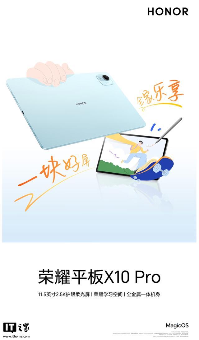 作为比较,荣耀平板 X9 Pro 发布于去年 12 月底,配备 11.5 英寸 120Hz 屏(分辨率 2000×1200 / 峰值亮度 400nits / 色域覆盖 100% sRGB)+ 4 扬声器 + 8300mAh 电池,并搭载骁龙 685 处理器,定价 1099 元起。
