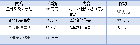 包含综合意外身故伤残和交通工具意外身故伤残保障金,可根据自己的需要同时投保,如发生公共交通意外事故,将按照投保的保障额度叠加赔付保障金。综合意外身故伤残保障金(保额最高可达50万)所有意外伤害事故导致的身故/伤残。公共交通工具意外身故伤残保障金(含:飞机、火车、轮船、汽车意外身故/伤残,保额分别高达800万、100万、100万、30万)