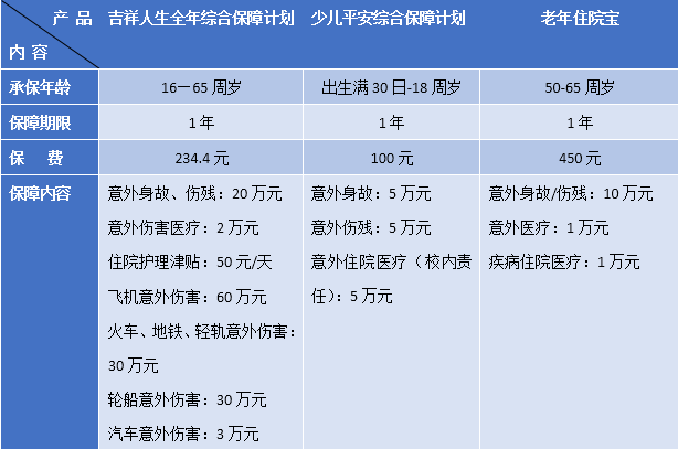 1.我们简单的列出来三款,可以看出来保障最为广泛的是吉祥人生,但是这款产品是三款产品中价格中等的。最贵的是老年住院保,最便宜的是少儿平安综合保障计划。