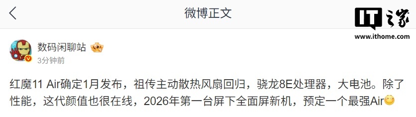 红魔 11 Air 确定 1 月发布,祖传主动散热风扇回归,骁龙 8E 处理器,大电池。除了性能,这代颜值也很在线,2026 年第一台屏下全面屏新机,预定一个最强 Air