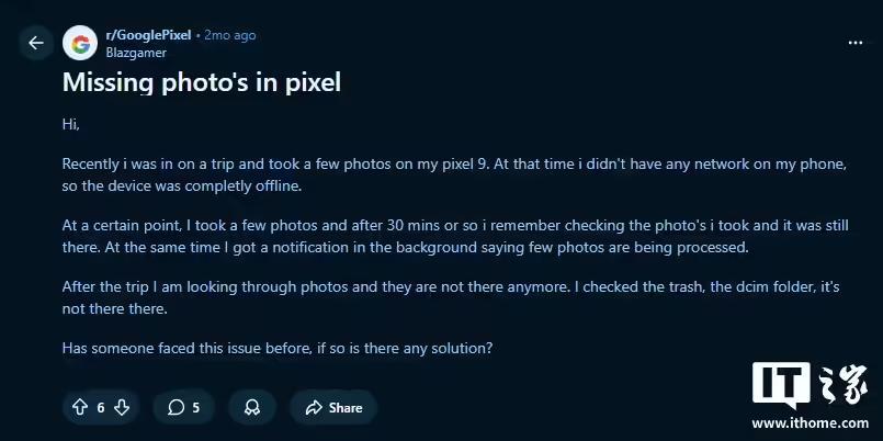 IT之家 12 月 24 日消息,据 AndroidAuthority 报道,部分谷歌 Pixel 系列手机出现异常故障,导致用户照片丢失。近日,有多位 Reddit 论坛用户发帖反映,用 Pixel 手机拍摄的照片“不翼而飞”,既未出现在本地存储中,也没有备份到谷歌相册(Google Photos)。
