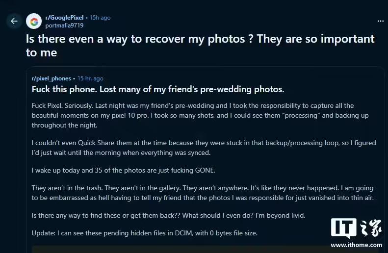 此外,Reddit 上还有一则发布者账号已注销的旧帖,内容也与该问题高度相似。有评论者表示,自己的 Pixel 10 Pro、Pixel 10、Pixel 9a 和 Pixel 8a 机型均出现过相同故障。从用户反馈来看,许多受影响者都是在短时间内拍摄大量照片后遭遇此问题;还有多名用户称,在手机的 DCIM 文件夹中发现了一批异常的 JPG 文件,这些文件名称中均包含“pending”(待处理)字样,且文件大小均为零字节。