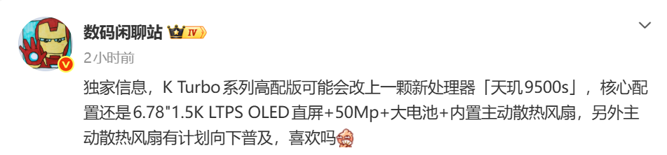 凤凰网科技讯 12月24日,据数码博主“数码闲聊站”透露,OPPO旗下K Turbo系列新品的高配版本可能将搭载一款名为“天玑9500s”的新处理器。该博主表示,新机核心配置预计仍为6.78英寸1.5K LTPS OLED直屏、5000万像素主摄、大容量电池以及内置主动散热风扇。另有消息称,该主动散热技术计划向更多机型普及。