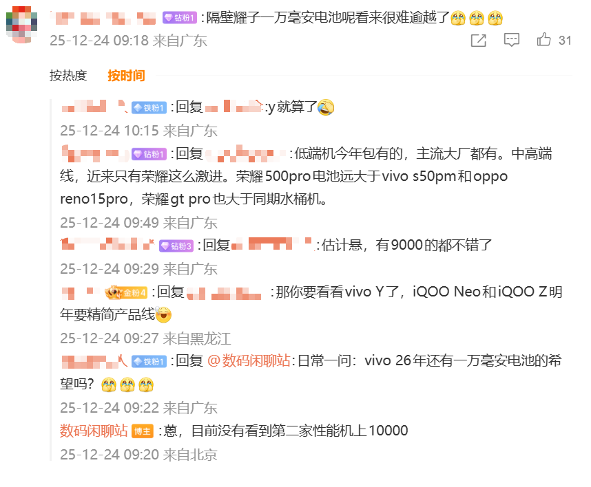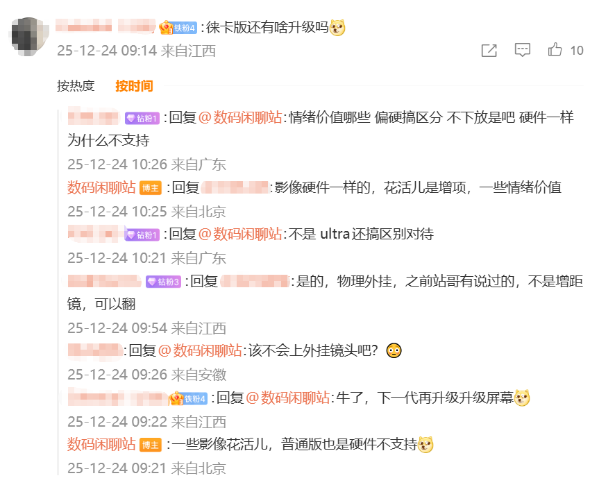 针对其他问题,该博主在评论互动中提到,目前未见到其他性能机型配备10000mAh电池;而对于小米17 Ultra徕卡版的升级,他表示主要在影像方面,并指出普通版因硬件限制不支持相关功能。