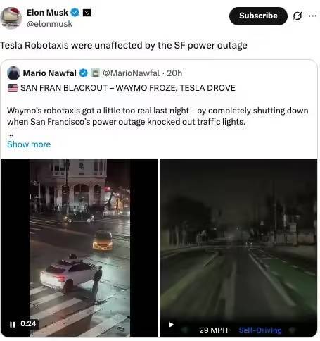 马斯克在社交媒体上的这句冷嘲热讽,把刚因意外停摆的 Waymo 推向了尴尬的境地。