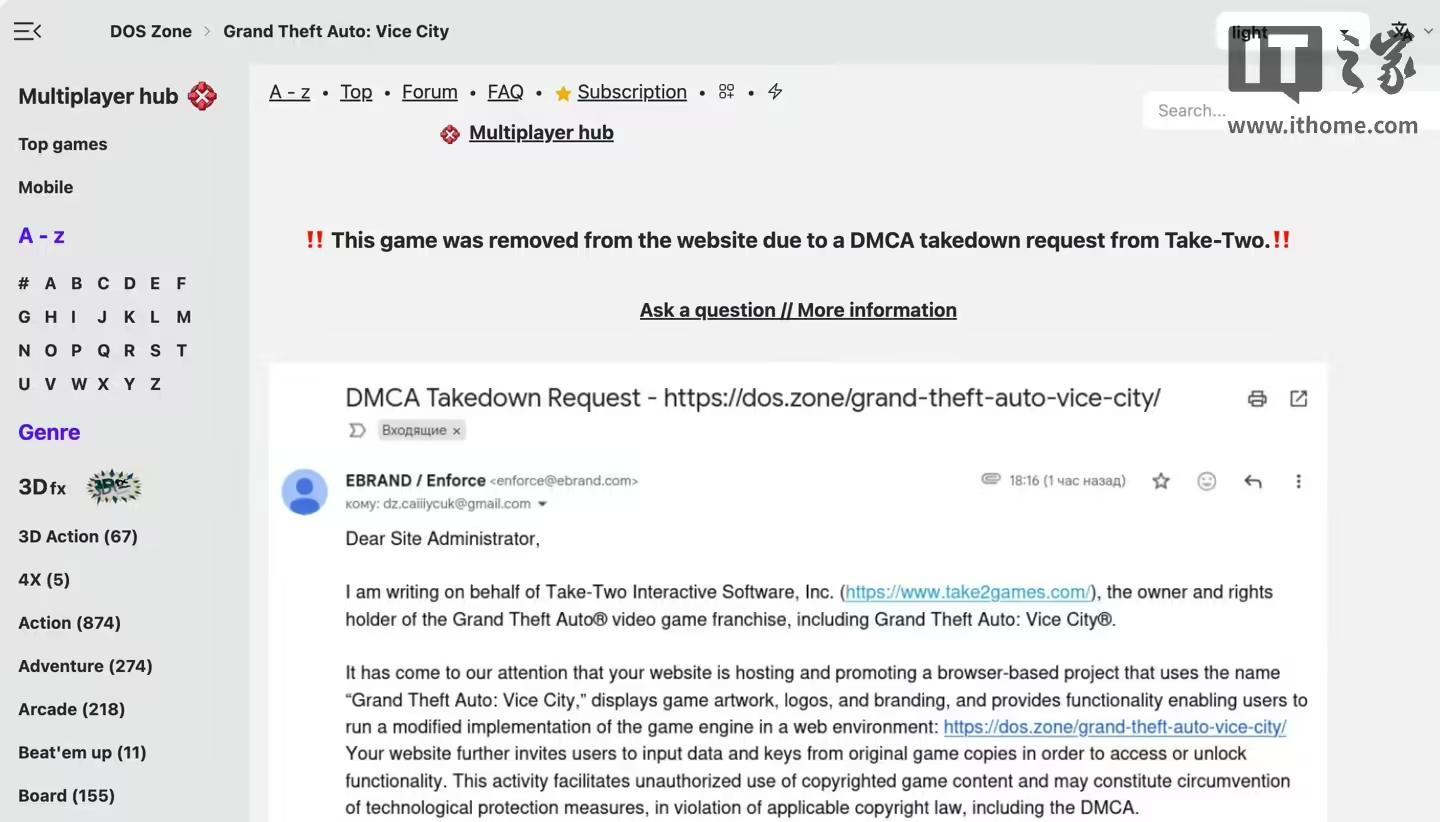目前访问 DOS.Zone 的《GTA:罪恶都市》页面,可以看到明确提示:游戏因收到 Take-Two 提出的 DMCA 下架请求而被移除。页面还展示了一封由网页保护公司 Ebrand 转发的邮件,邮件表示相关行动是代表 Take-Two 提出的,并要求删除所有与《GTA:罪恶都市》有关的内容,同时警告若不配合,Take-Two 将保留进一步采取法律措施的权利。