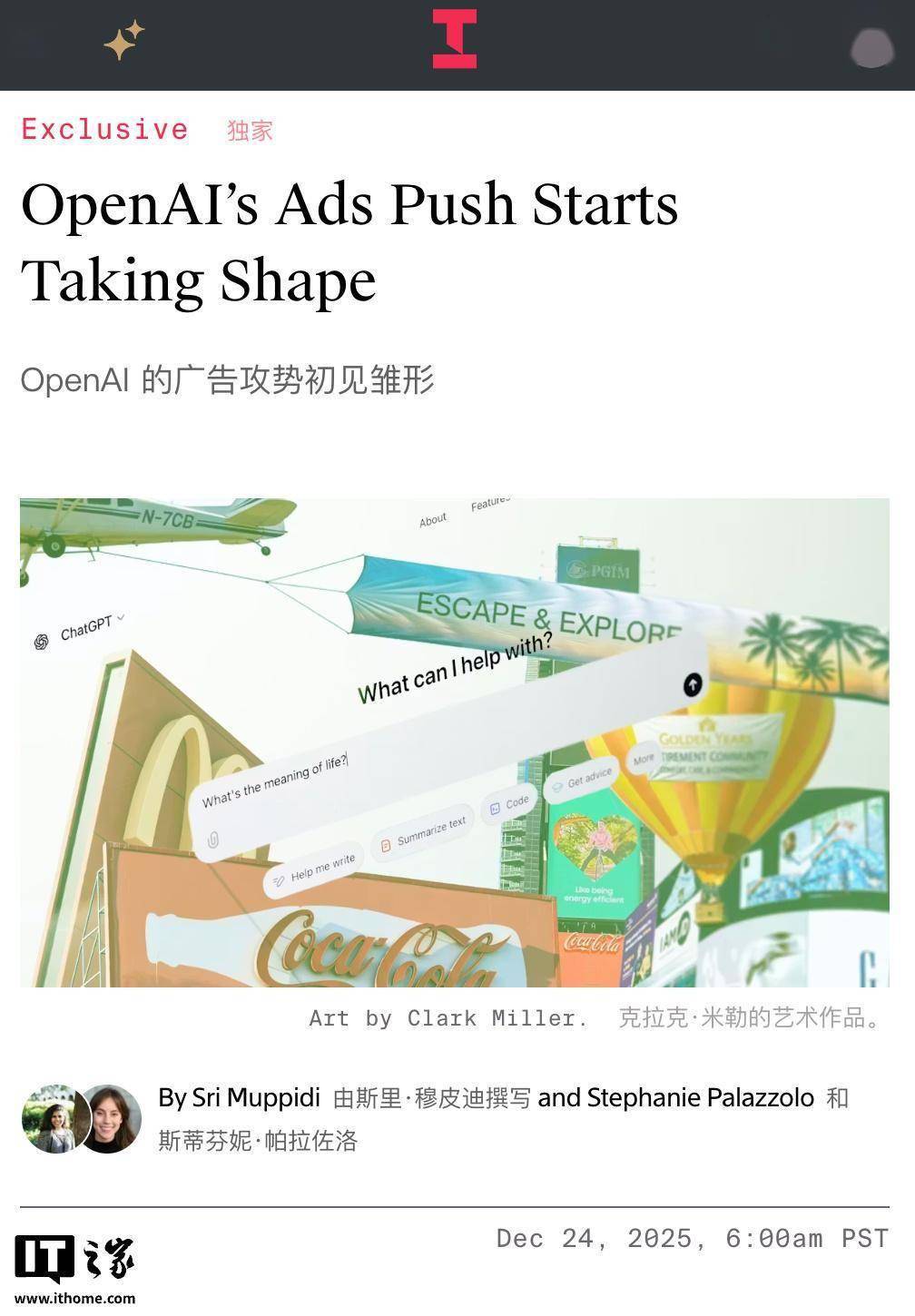 IT之家 12 月 24 日消息,今天晚间,据 The Information 援引知情人士消息称,OpenAI 员工正在研究调整 AI 模型的方式,在用户提出与消费相关的问题时,让赞助信息更容易出现在 ChatGPT 的回答中。譬如,当用户咨询睫毛膏推荐时,可能会看到由丝芙兰赞助的产品信息。与此同时,团队也在设计多种广告展示原型,探索广告在 ChatGPT 界面中的呈现形态。