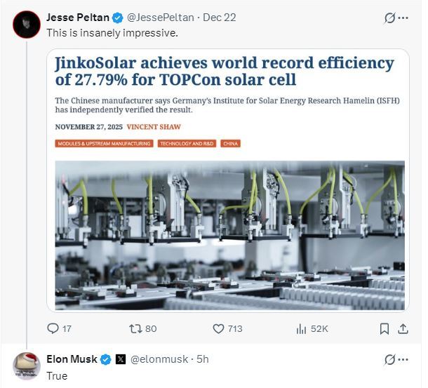 凤凰网科技讯,12月25日,晶科能源近日宣布,其基于TOPCon技术平台的高效电池最高光电转换效率达27.79%,经德国哈梅林太阳能研究所(ISFH)权威认证,刷新世界纪录。社交平台X上的一位用户分享了有关晶科能源这项新纪录的报道,并评论称:“这真是令人疯狂地印象深刻。”马斯克评论称:“确实如此。”