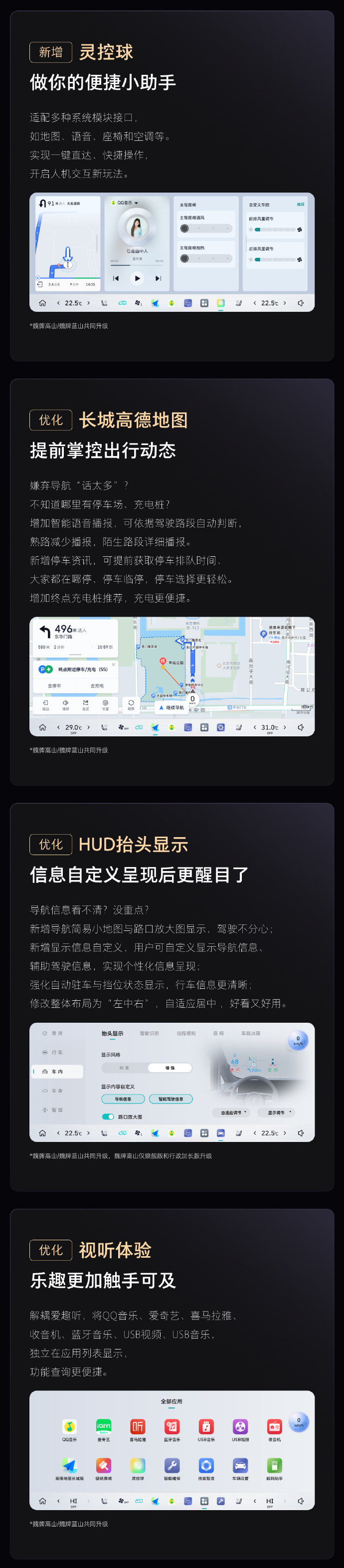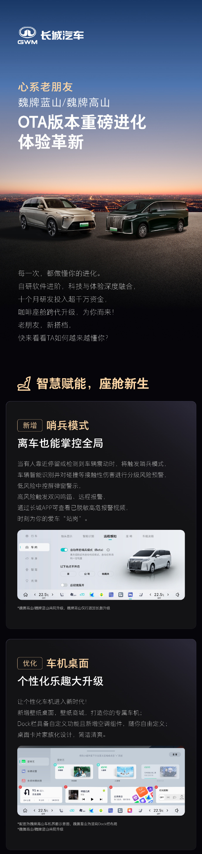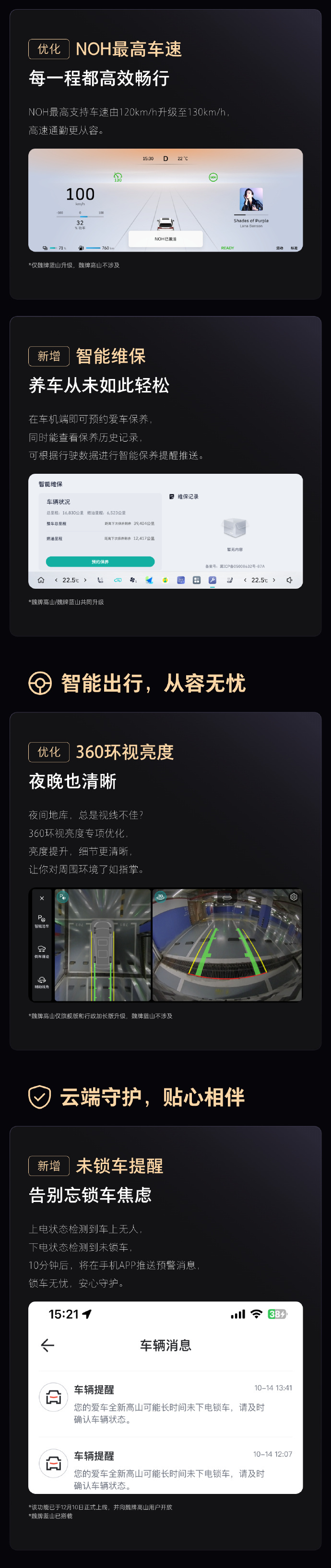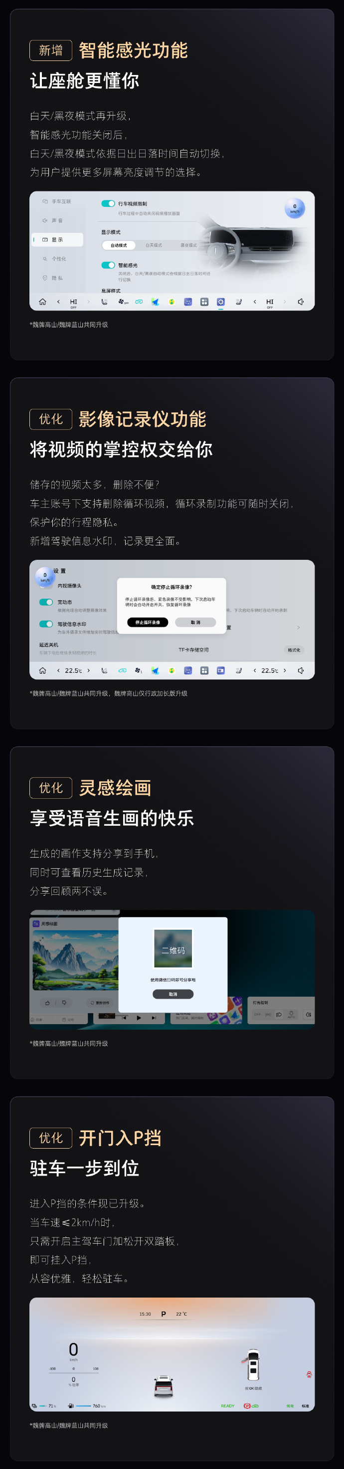 凤凰网科技讯 12月25日,长城汽车魏牌CEO赵永坡发文称,今天将对23款蓝山、高山车型进行智能座舱系统OTA大升级,新增哨兵模式、灵控球、智能感光、四驱模式专属按钮等;并优化了影像记录仪、NOH最高车速等部分功能。