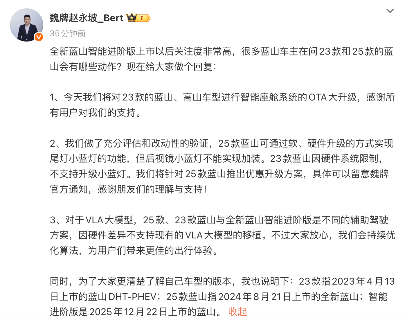 此外,25款、23款蓝山与全新蓝山智能进阶版是不同的辅助驾驶方案,因硬件差异不支持现有的VLA大模型的移植。不过公司会持续优化算法,为用户们带来更佳的出行体验。