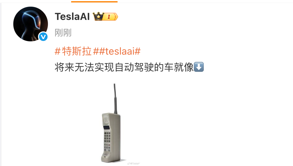 凤凰网科技讯 12月25日,特斯拉官方账号发文,称将来无法实现自动驾驶的车就像“大哥大”。