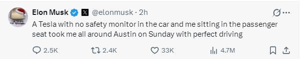 稍早前,马斯克在X上发帖称:“上周日,一辆没有安全监督员的特斯拉载着我坐在副驾驶座上环游了奥斯汀,整个行程完美。”