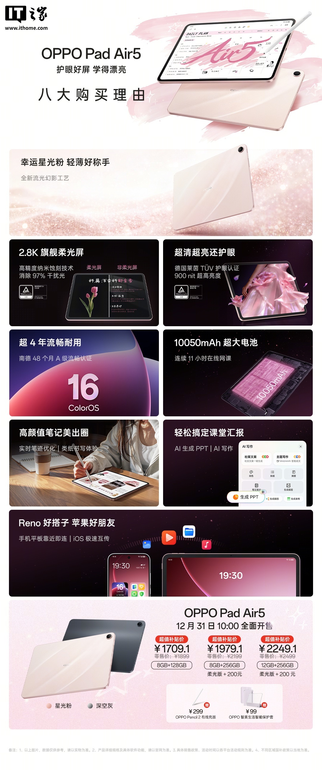 IT之家 12 月 25 日消息,OPPO Pad Air5 平板电脑今日正式发布,售价 1899 元起,超值补贴价 1709.1 元起,今日 10 点开启预售,12 月 31 日正式开售。IT之家附具体售价如下: