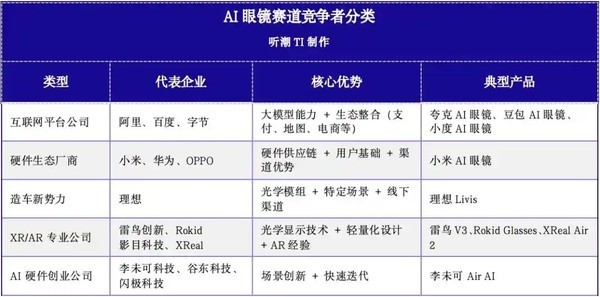 而当前市面上的AI眼镜品类繁多,定价跨度极大,从数百元到数千元的产品应有尽有。其主要原因在于产品形态的差异化定位。听潮TI曾对目前国内AI眼镜市场的竞争者进行了清晰划分,主要可分为以下五类(下图)。