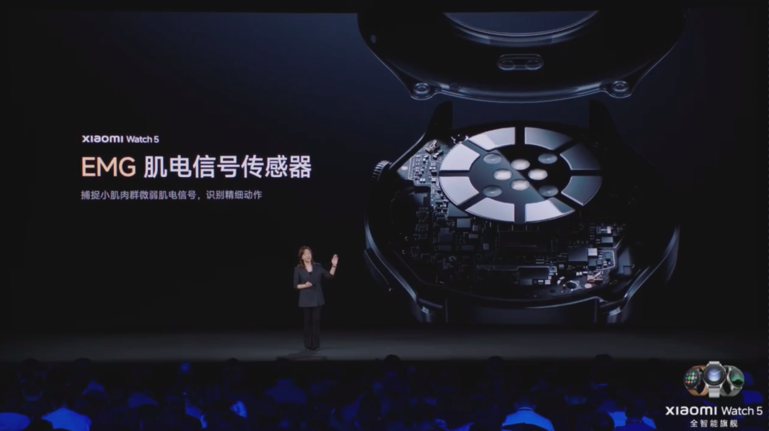和 Apple Watch 不太一样的点在于,小米 Watch 5 实现手势控制的方式是在表背上加了一个 “ EMG 肌电信号传感器 ” ,用来捕捉肌电信号,从而实现更精细的手势控制。
