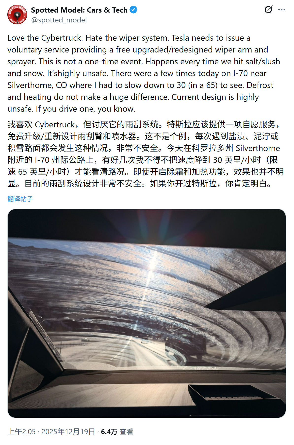 相比此前 Model 3 和 Model Y 因软件算法导致的自动雨刮“乱刮”或“不刮”问题,Cybertruck 面临的是更为棘手的物理结构失效。