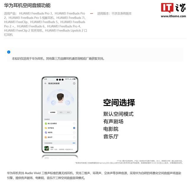 IT之家从华为官网获悉,华为 FreeBuds Pro 5 / 4 / 3 / 2 系列、FreeClip 1 / 2、FreeBuds 7i、FreeBuds 6、FreeBuds 5 等耳机支持 Audio Vivid 三维声标准,采用华为自研的场景化空间音频声场渲染引擎,可提供有声剧场、电影院、音乐厅三种空间音频音效模式。