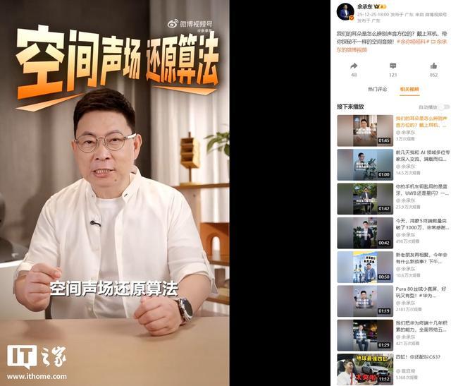 IT之家 12 月 25 日消息,华为常务董事、产品投资评审委员会主任、终端 BG 董事长余承东今日发布视频,详细介绍了耳机空间音频的技术原理,并透露只需要在两只耳机中模拟不同的波形变化,就可以让声音出现在任何位置。