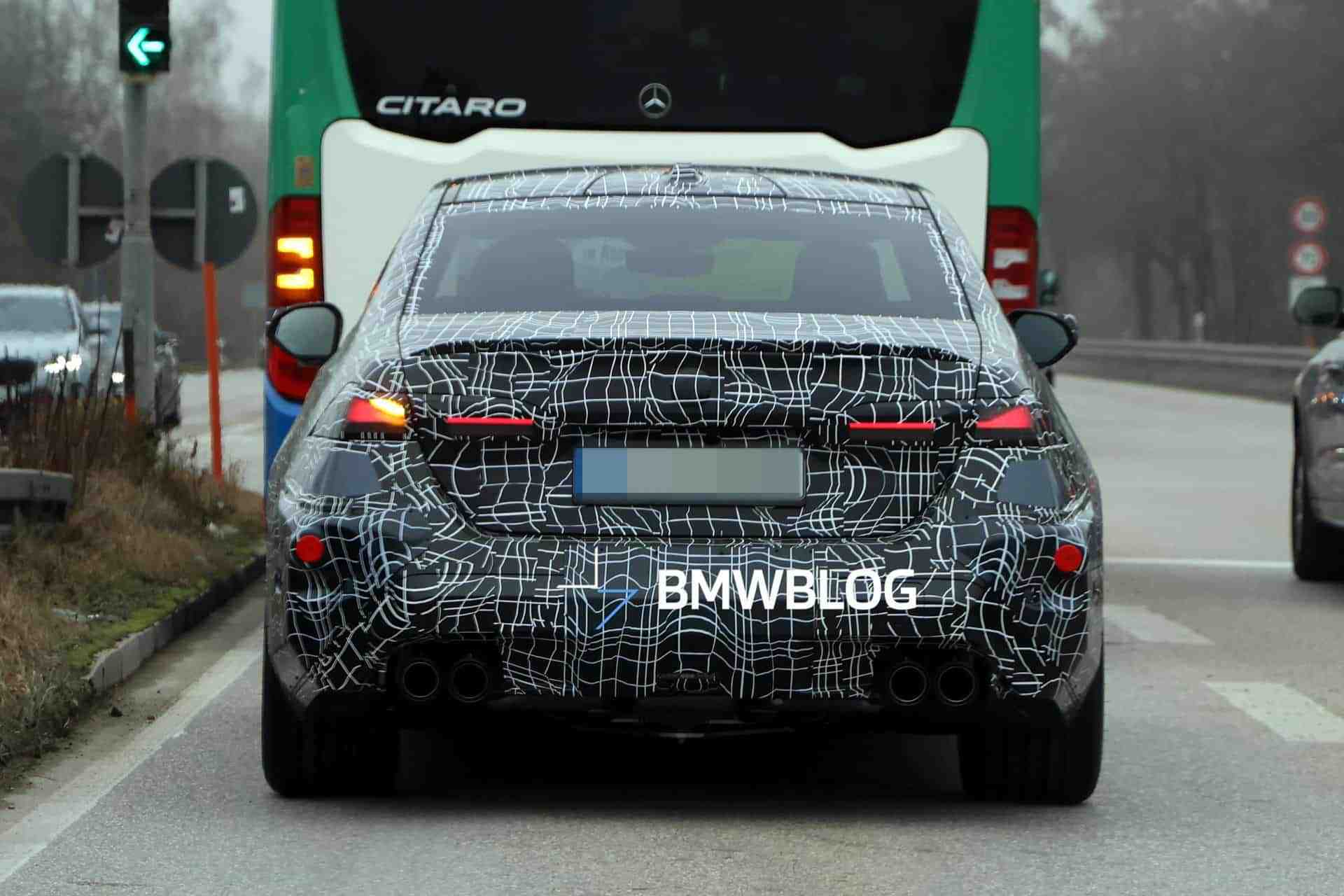 之前的测试车曝光的 M5,它的灯组是连成一片的,很明显,这是用上了宝马 Neue Klasse 这一代设计语言。但最新的谍照显示,宝马让双肾格栅与大灯重新分离,一定程度上回归了传统。