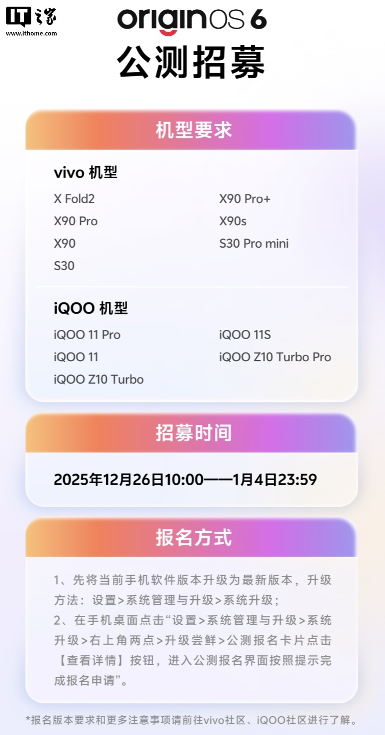 IT之家 12 月 26 日消息,vivo 今天在微博宣布,OriginOS 6 系统现已开启新一轮公测招募报名,涵盖 vivo 和 iQOO 品牌共计 12 款机型。