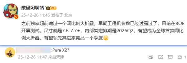 【CNMO科技消息】12月26日,数码博主“数码闲聊站”爆料称,一个阔比例大折叠目前正在京东方(BOE)进行屏幕测试,内屏尺寸预计在7.6至7.7英寸左右。其内部暂定排期瞄准2026年第二季度发布。并且博主称,该机可能领先其他竞争对手的同类产品约一个季度,有望成为全球首款阔比例大折叠手机。网友猜测认为这款手机可能为华为Pura X2。