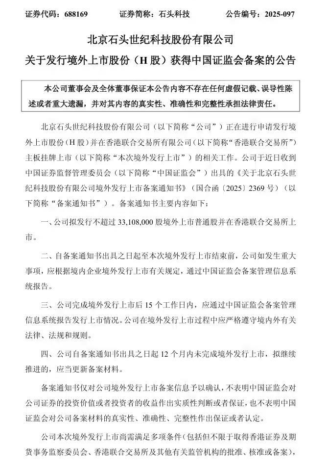 IT之家 12 月 26 日消息,石头科技今日公告,公司于近日收到中国证监会出具的《关于北京石头世纪科技股份有限公司境外发行上市备案通知书》。公司拟发行不超过 33,108,000 股境外上市普通股并在香港联合交易所上市。
