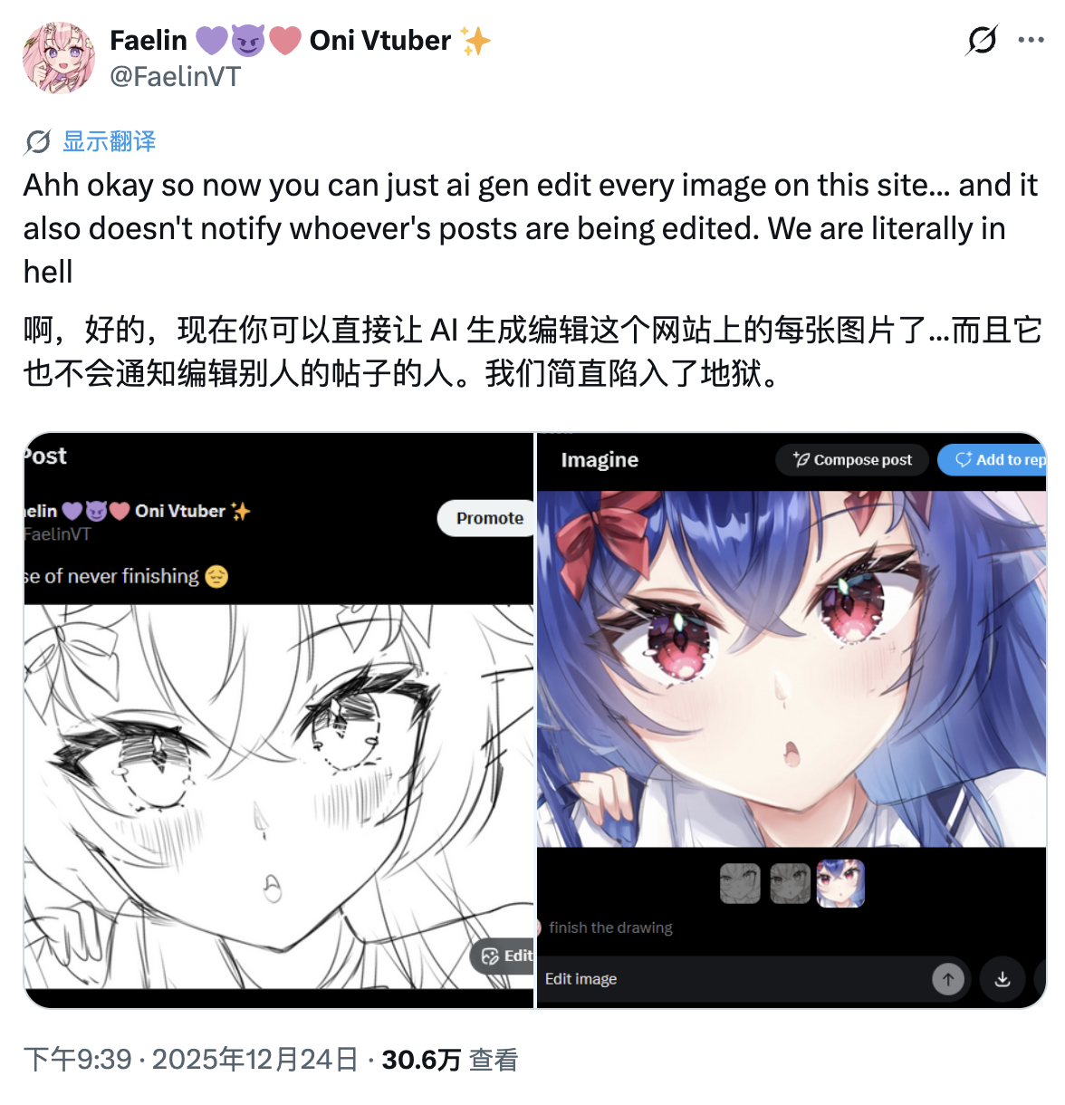 起因是社交平台 X 上线了一个基于 Grok 模型的「AI 编辑」功能。用户只需长按手机图片或点击网页版的「编辑图片」按钮,就能输入文字指令,让 AI 随意修改别人发布的作品。