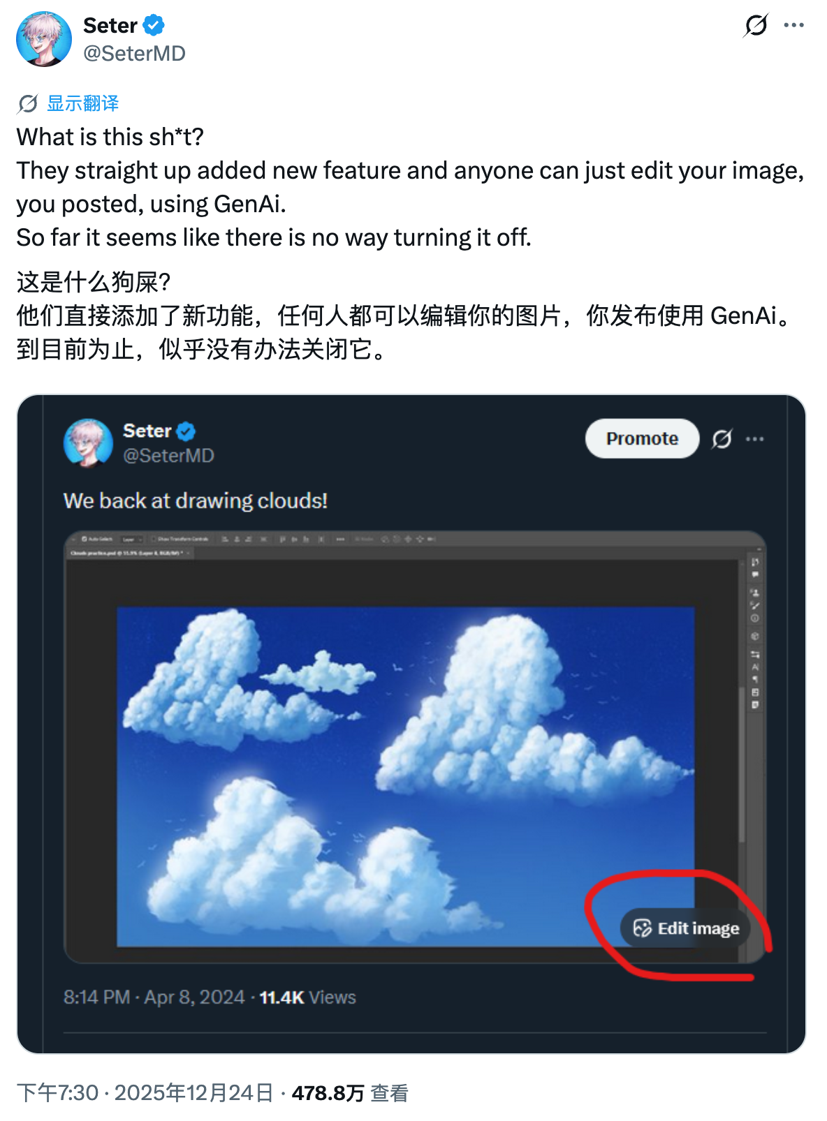 单看功能描述,它和其他 AI 改图工具并无本质区别。但是,这项功能对所有公开图片生效,也就意味着任何人在 X 上都能随意编辑他人发布的图片,而且原作者也不会收到通知。